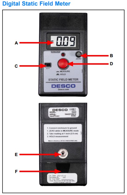 A. Màn hình LED: hiển thị kết quả do theo Kv/inch B. Nút xoay "Zero": Thiết lập điểm tham chiếu 0 Volt C. Công tắc bật tắt nguồn D. Nút "Đo/Giữ ": Nhấn giữ nút liên tục để tiến hành đo và nhả nút nếu muốn "đóng băng" để giữ kết quả đo đang hiển thị trên màn hình LED. Trạng thái " đóng băng" giữ kết quả đo được thể hiện bằng đèn báo LED phía trên. E. Chốt kết nối với dây nối đất đi kèm máy dài 12 inch F. Vị trí nắp tháo ra để thay PIN  |