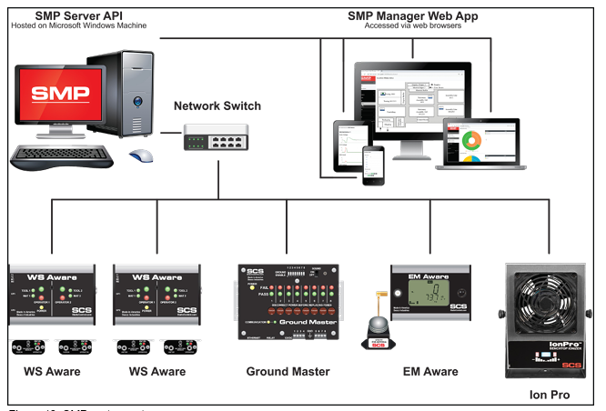 SCS WS Aware Monitor tương thích với SCS Static Management Program (SMP). SMP liên tục giám sát hệ thống kiểm soát quy trình ESD của bạn trong suốt mọi giai đoạn sản xuất. SMP thu thập dữ liệu từ máy trạm SCS, thiết bị và màn hình giám sát liên tục sự kiện ESD, cũng như máy ion hóa quạt đơn. Nó cung cấp hình ảnh thời gian thực về các quy trình sản xuất quan trọng. Mọi hoạt động đều được lưu trữ trong cơ sở dữ liệu để phục vụ mục đích kiểm soát chất lượng liên tục. SMP cho phép bạn xác định chính xác các khu vực đáng quan tâm và ngăn ngừa các sự kiện ESD. Dữ liệu định lượng cho phép bạn thấy được xu hướng, chủ động hơn và chứng minh hiệu quả của hệ thống kiểm soát quy trình ESD của bạn