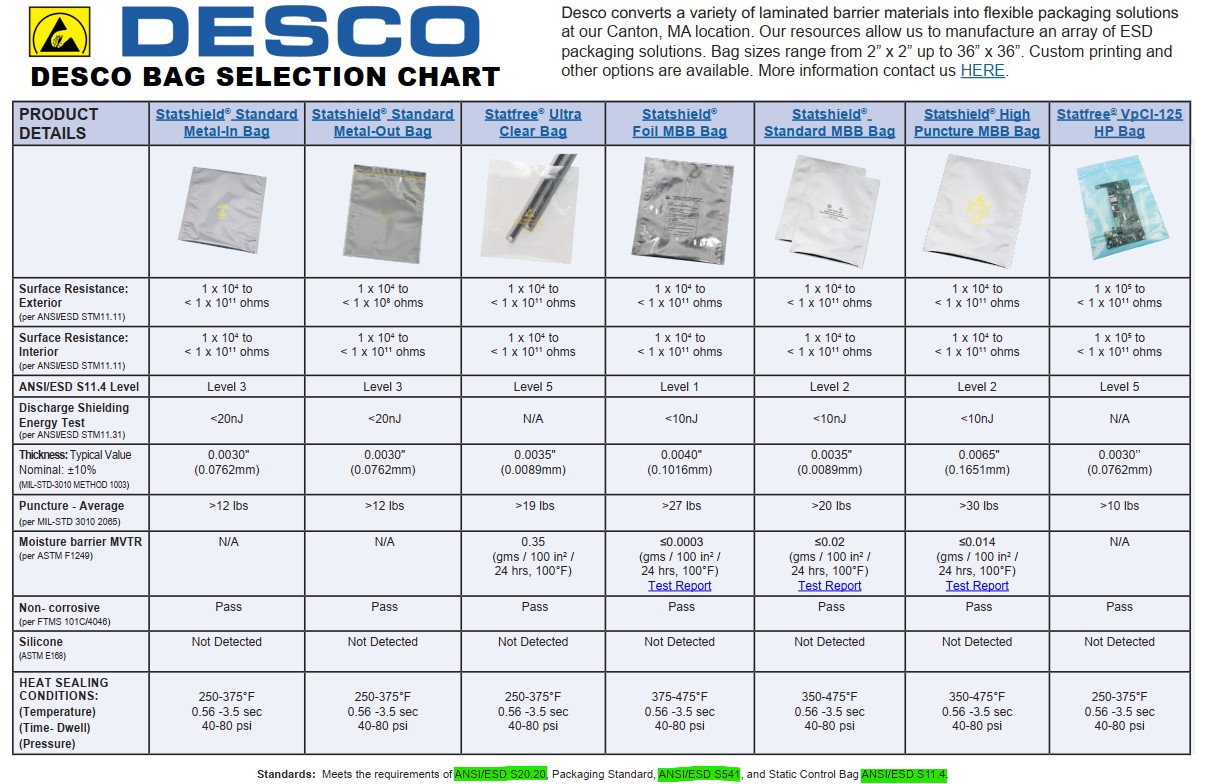Túi Static Shielding Bag của hãng DESCO đáp ứng mọi tiêu chuẩn về tĩnh điện như: ANSI/ESD S20.20, ANSI/ESD S541, ANSI/ESD S11.4