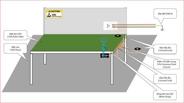 Tất cả các thành phần: Mặt bàn làm việc, vòng đeo tay, mặt sàn, dây tiếp địa được kết nối chung với nhau tại điểm nối đất chung CPG ( Common Point Gound).