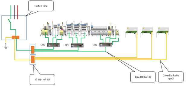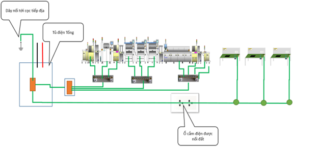 Nối đất cho khu vực làm việc, máy móc, thiết bị được kết nối tới hệ thống nối đất của thiết bị ( Chân thứ 3 của ổ điện AC)