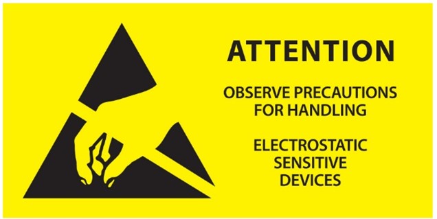Cửa vào khu vực kiểm soát ESD: Biển báo cảnh báo con người làm việc và khách rằng đây là khu vực lưu ý thực hiện kiểm soát chống tĩnh điện khi đi vào khu vực này. Cần sử dụng các trang bị cần thiết để bảo vệ các linh kiện ESDA.